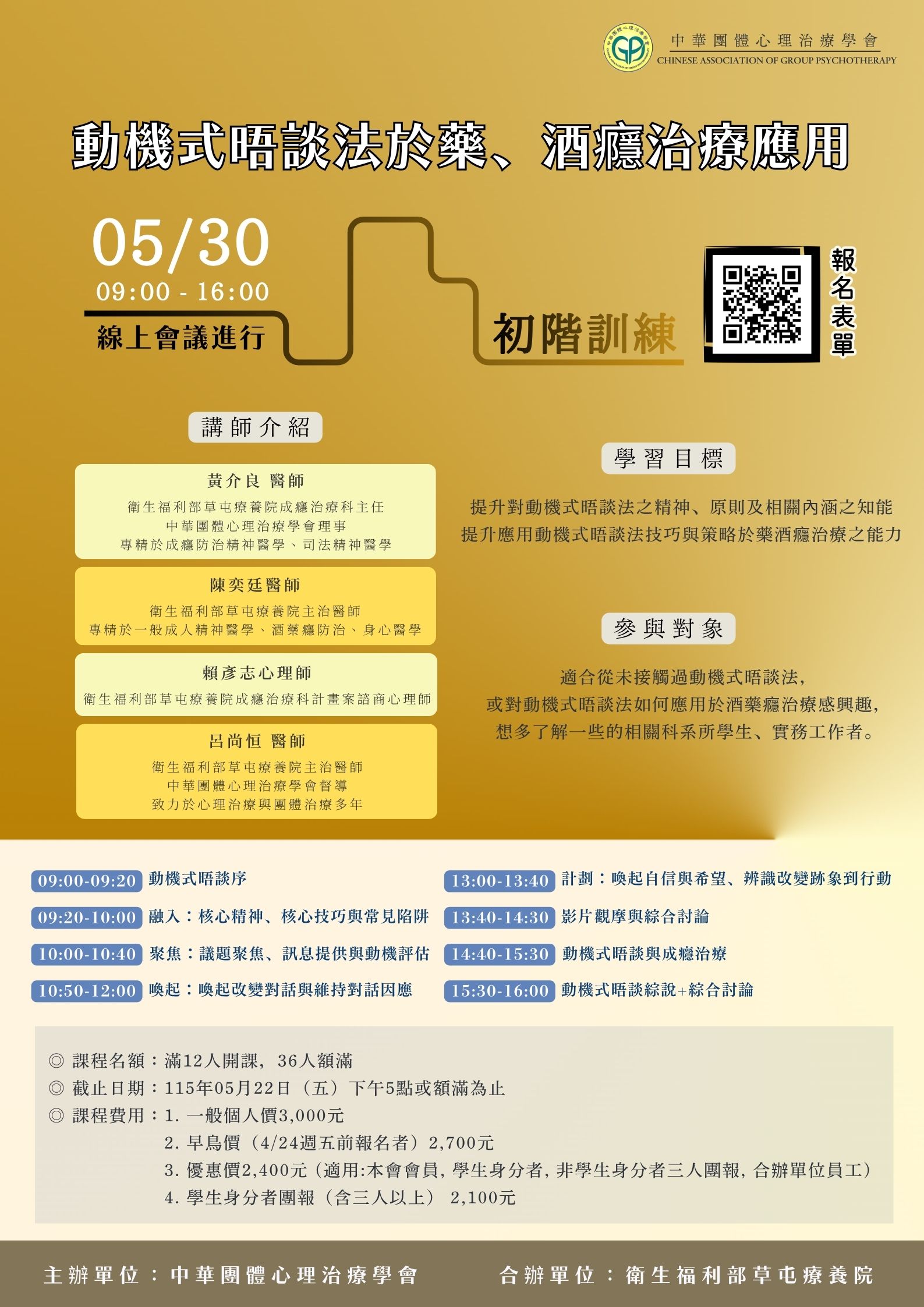 中華團體心理治療學會−115/05/30(六)動機式晤談法於藥、酒癮治療應用-初