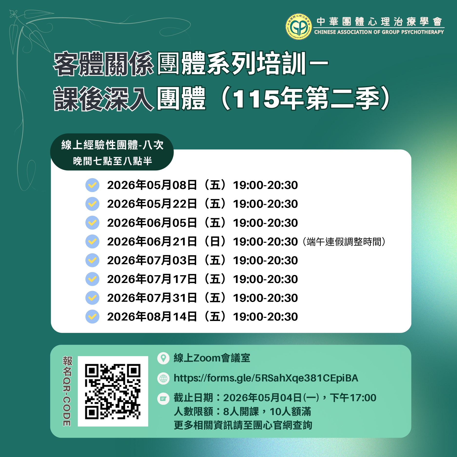 中華團體心理治療學會−115/05/08-08/14 客體關係團體系列培訓-課後深入團體