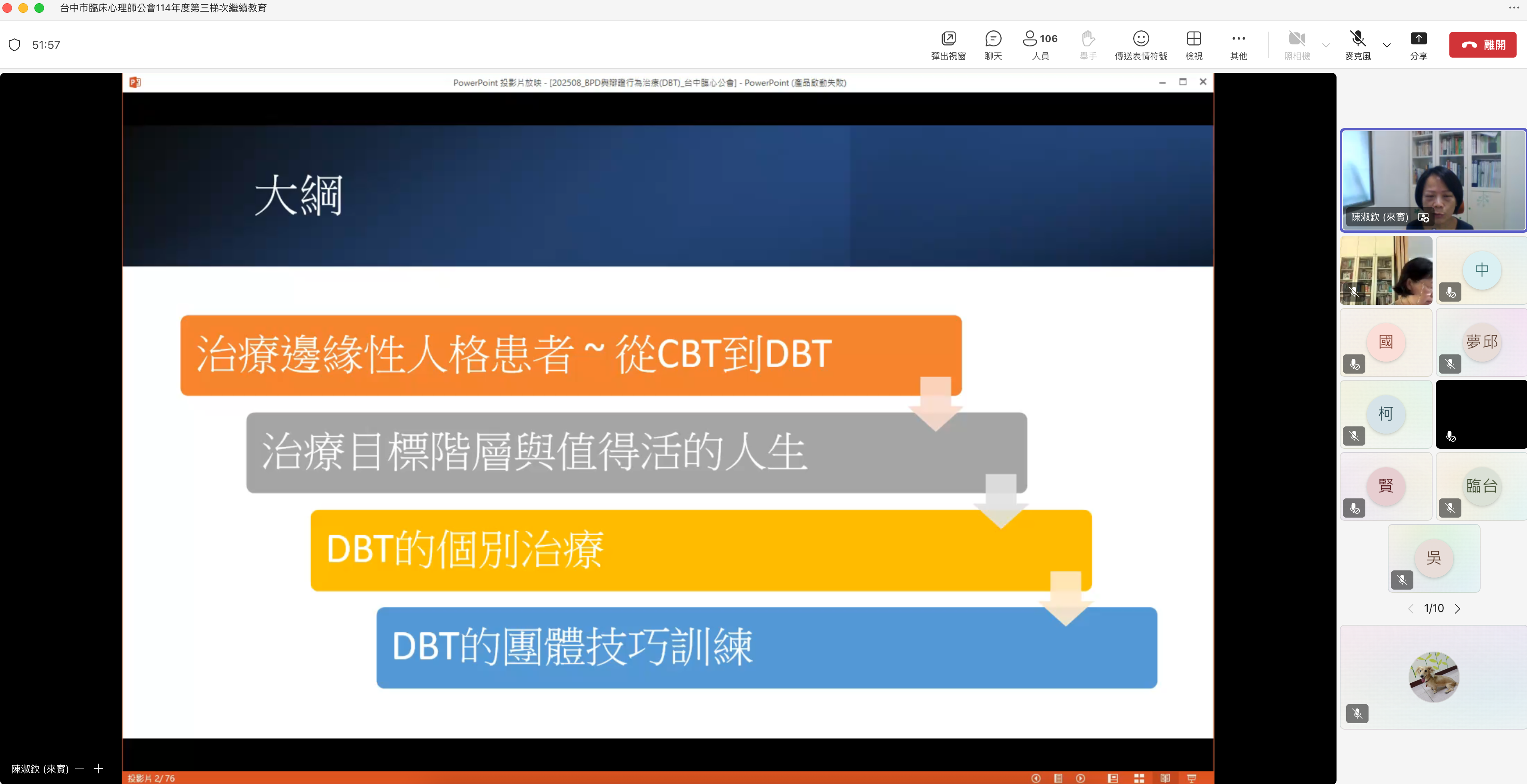 一、課程主題:從CBT到DBT 二、課程地點:課程地點:以 Microsoft Teams 進行線上授課 三、課程時間:2025.08.24 (日) 09:00−16:00 四、講師:陳淑欽臨床心理師