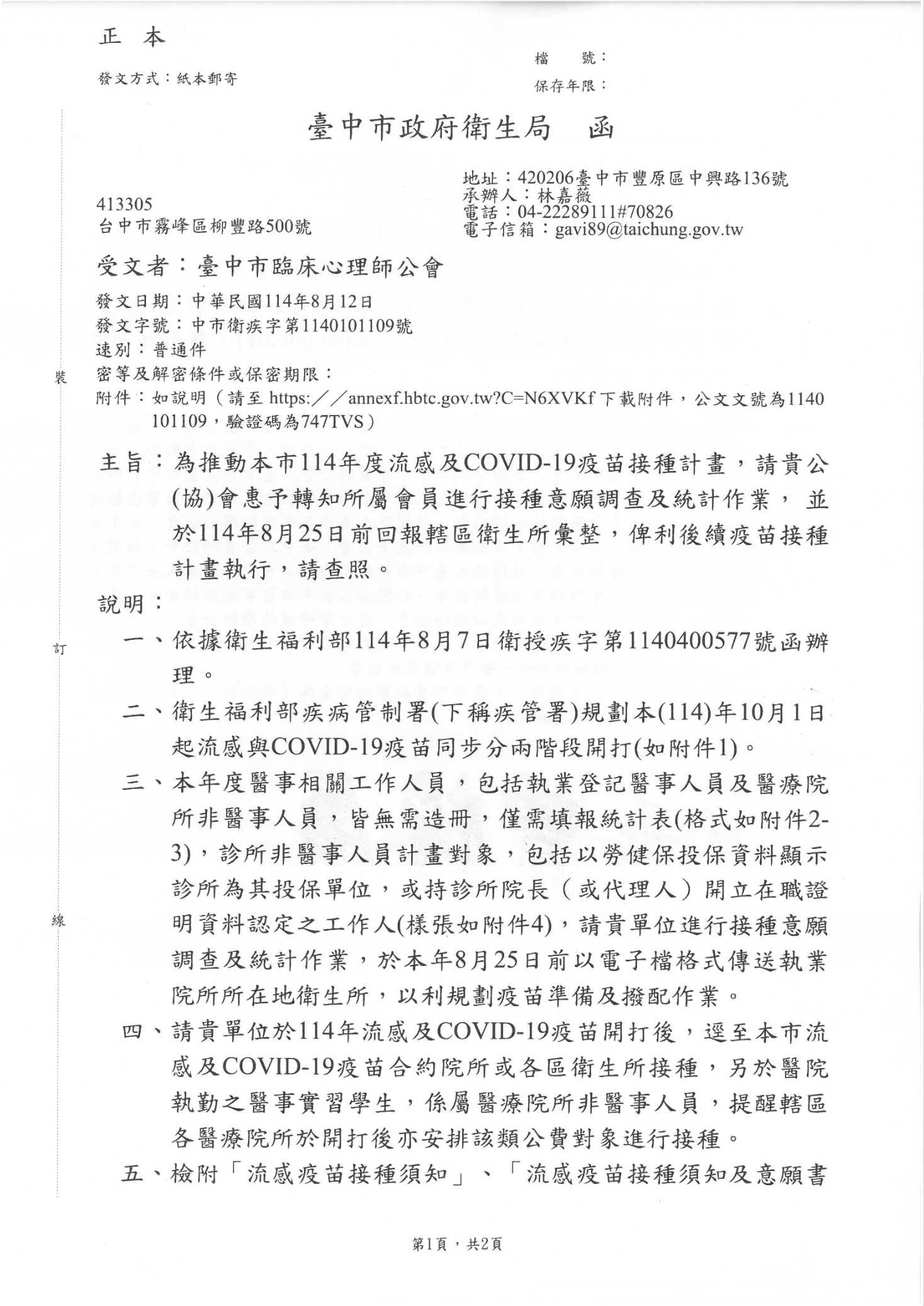 413305 台中市霧峰區柳豐路500號 台中市臨床心理師公會 (亞大心理系) 收