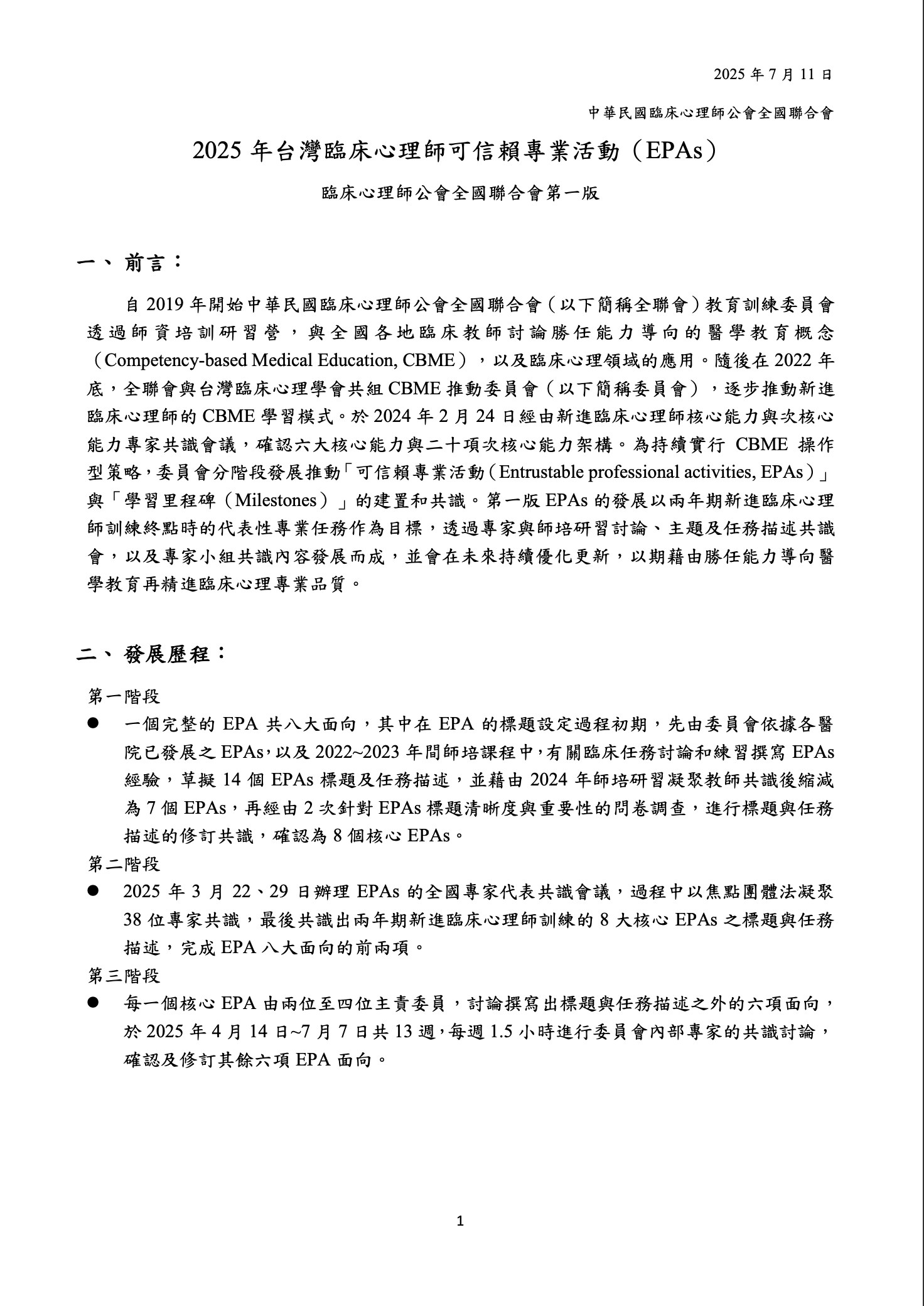 2025年台灣臨床心理師可信賴專業活動(EPAs)-臨床心理師公會全國聯合會第一版