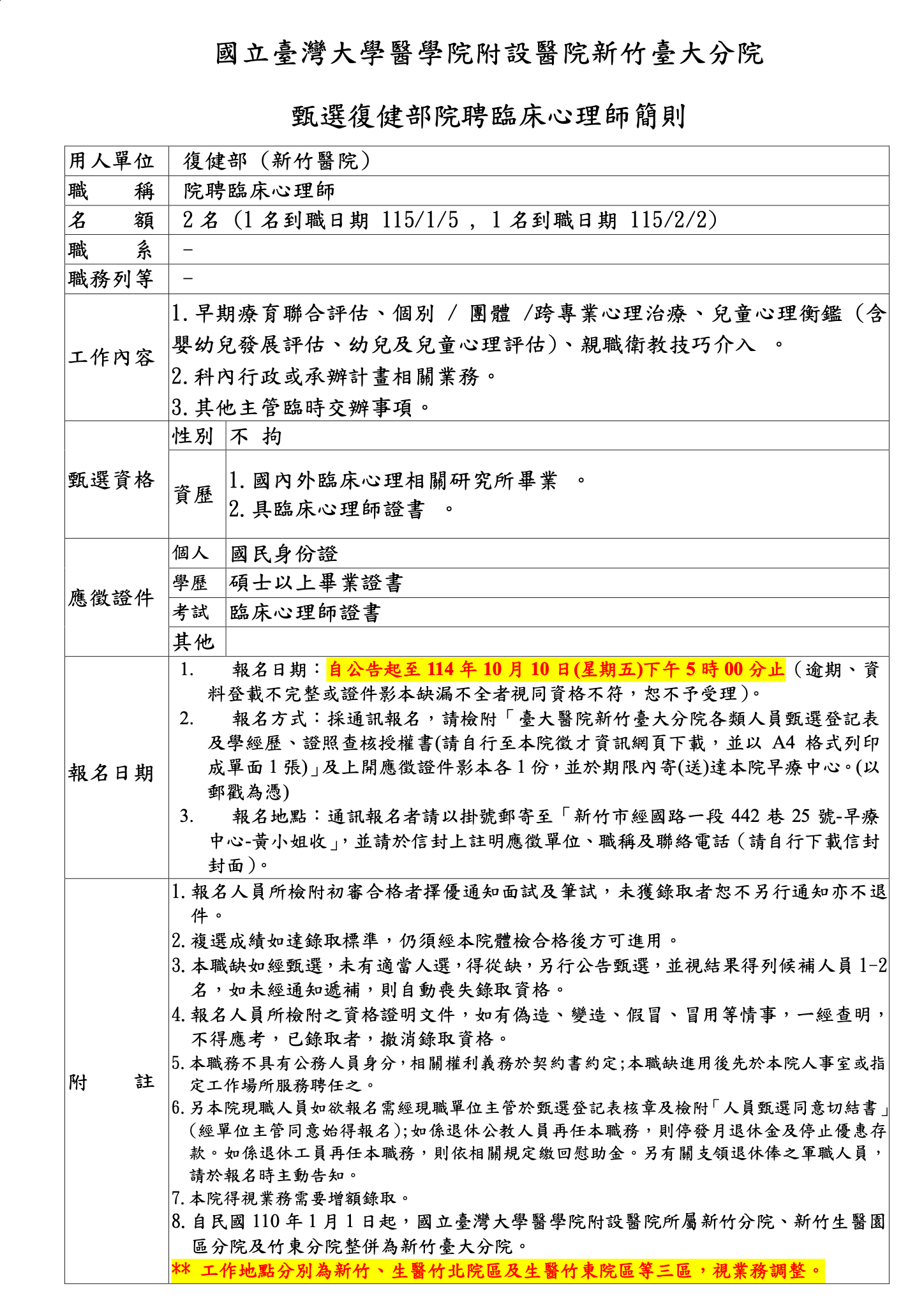 國立臺灣大學醫學院附設醫院新竹臺大分院復健部甄選2名院聘臨床心理師